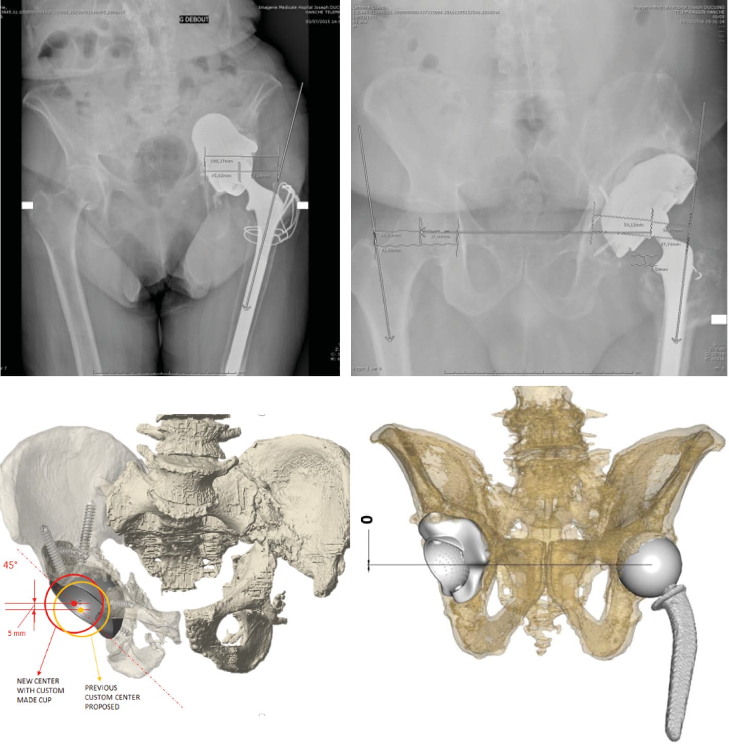 Unlike with modular implants, the custom manufacture does entail a lead time. It takes an average of 6-7 weeks from approval of the project to delivery of the implant. The CT acquisition protocol was simple to set up and there was no major inconsistency noted between the planning, the implant delivered and its positioning, which supports the conclusions of other teams [17], Baauw M, van Hellemondt GG, van Hooff ML, Spruit M. The accuracy of positioning of a custom-made implant within a large acetabular defect at revision arthroplasty of the hip. Bone Joint J. 2015;97-B(6):780-785. doi:10.1302/0301-620X.97B6.35129[18] Zampelis V, Flivik G. Custom-made 3D-printed cup-cage implants for complex acetabular revisions: evaluation of pre-planned versus achieved positioning and 1-year migration data in 10 patients. Acta Orthop. 2021;92(1):23-28. doi:10.1080/17453674.2020.1819729 In two cases, the manufacture was delayed and this meant the surgery had to be postponed for a week.