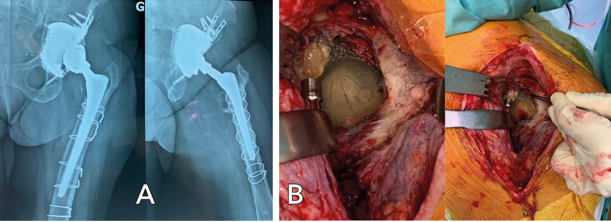 In the literature [5] Migaud H, Common H, Girard J, Huten D, Putman S. Acetabular reconstruction using porous metallic material in complex revision total hip arthroplasty: A systematic review. Orthop Traumatol Surg Res. 2019;105(1S):S53-S61. doi:10.1016/j.otsr.2018.04.030, these are the most common complications, and this was also the case in our series: Out of our first 30 patients, six presented dislocations repeatedly during the first few weeks (20%) (Figure 13). In all of these cases, there were multiple causes: learning curve, managing design and positioning of the implant, or of the DM cup in relation to the implant, number of revisions, extent of muscle loss. We found a number of different solutions, including: