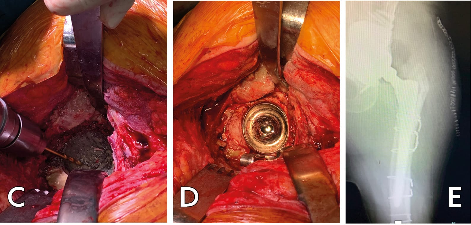 The last two cases involve cemented implantation with potentially more extensive approaches and greater risks to the sciatic nerve, especially for Triflange implants. In view of the manufacturing and delivery time frames for these different implants, it is possible to carry out a temporary head/neck resection with the femoral implant left in place, which is of course made possible through disconnecting the modular necks.