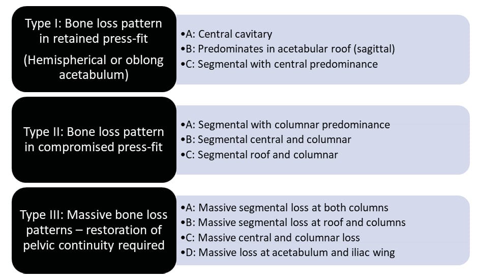 A preoperative cross-referenced analysis of acetabular bone loss aimed to determine whether any one classification or combination of classifications would prove to stand out as useful in predicting the true picture of perioperative defects and planning the fixation type.
