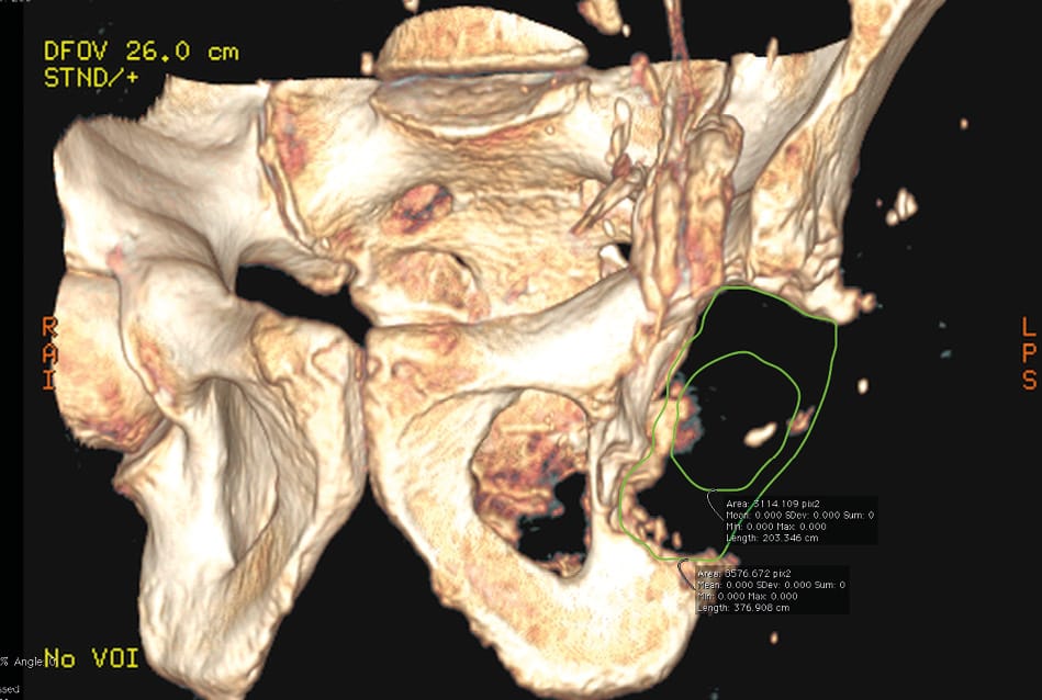 - A CT scan of the acetabulum is performed that uses slices maximum 2mm thick and 3D bone reconstruction focusing on the part to be reconstructed and the neighbouring area.