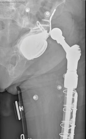Eight years after acetabular revision, a fall led to loosening of a dual mobility implant without compromising fixation of a 3D-printed implant.