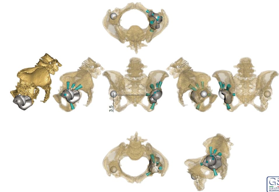 - Custom-made implants: four are currently on the market (MaterialiseTM 2009, Lima custom-made Trabecular TitaniumTM 2007, Adler custom-made Ti-porTM 2010, SERF ARM with surface that promotes bone ingrowth 2016). A fifth option that must be added is the Gruppo Bioimplanti CustoMizedTM. Just a few publications have provided follow-up information on these implants, with survival rates for the first four ranging from 88.5% at 54 months to 100% at 67 months [5] Migaud H, Common H, Girard J, Huten D, Putman S. Acetabular reconstruction using porous metallic material in complex revision total hip arthroplasty: A systematic review. Orthop Traumatol Surg Res. 2019;105(1S):S53-S61. doi:10.1016/j.otsr.2018.04.030.