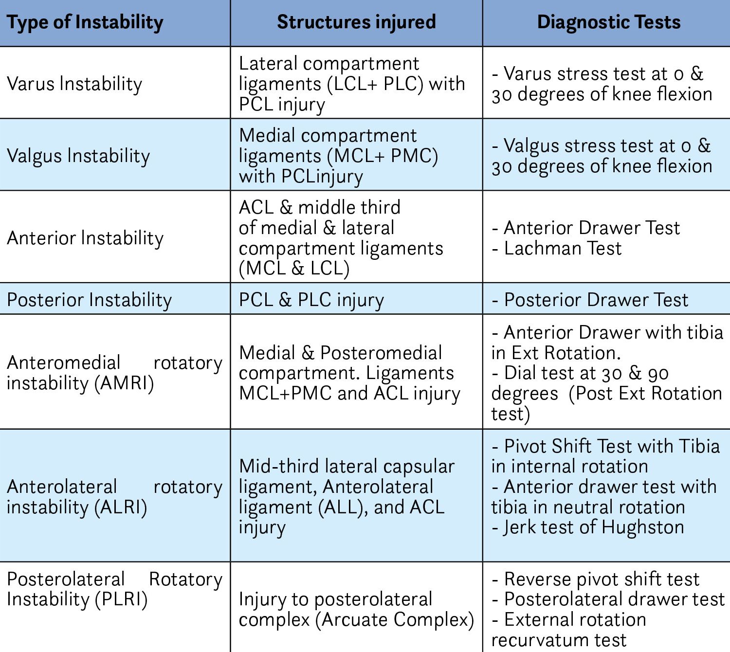 The knee joint lacks inherent bony stability and is dependent on the ligamentous structures attached around the knee to provide stability. Knee instability is a complex problem, accentuated by presence of multiligamentous injuries.Although MRI is the gold standard diagnostic modality for diagnosis of acute as well as chronic knee instabilities, a thorough and detailed clinical examination of the injured knee is of utmost importance, especially in diagnosis of rotatory injuries as these injuries can sometimes be missed even on a MRI. Knee instability can be broadly classified into tibiofemoral instability and patellofemoral instability. Tibiofemoral instability is further subdivided into straight and rotatory instability. In straight instability there is abnormal gliding between tibia and femur either in the frontal or the sagittal plane.In rotatory instabilities there is abnormal forward or backward translation and rotation of the tibial condyle relative to femoral condyle. It is of utmost importance to understand the contribution of anatomic structures to the stability of the knee. By being thorough in the anatomy of the knee esp the posteromedial and the posterolateral corner of the knee an orthopedic surgeons ability to clinically diagnose patterns of knee injuries and various types of knee instabilities can be greatly enhanced.