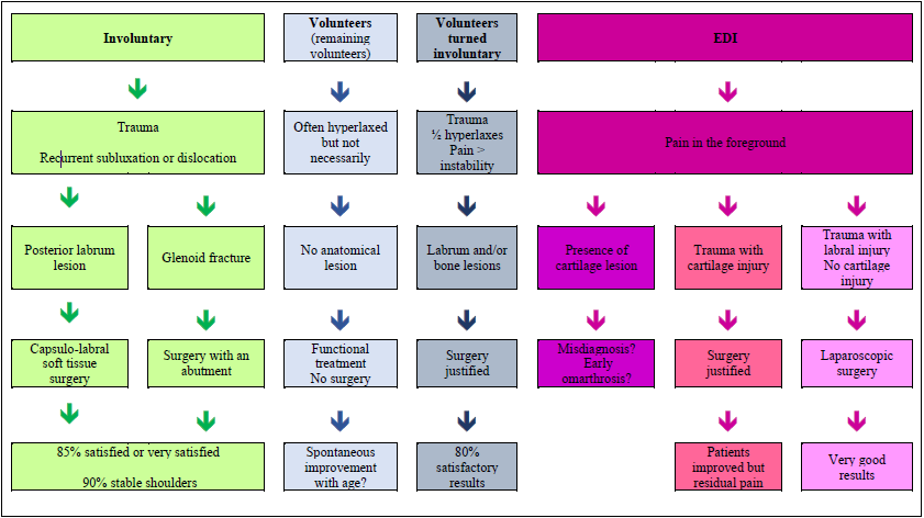 Functional treatment is the only option for reproducible, voluntary posterior shoulder instability. It offers holistic management comprising all aspects of the condition, especially any psychological or psychiatric aspects. These patients should never be operated. It really is a young person’s condition, because the vast majority of patients are under thirty, and it is very rare to see anyone in their fifties or sixties with this particular clinical presentation. The condition ought to improve with age. However, following traumatic decompensation of voluntary-to-involuntary instability associated with anatomical lesions, the indications for surgery should be discussed.