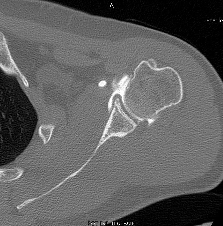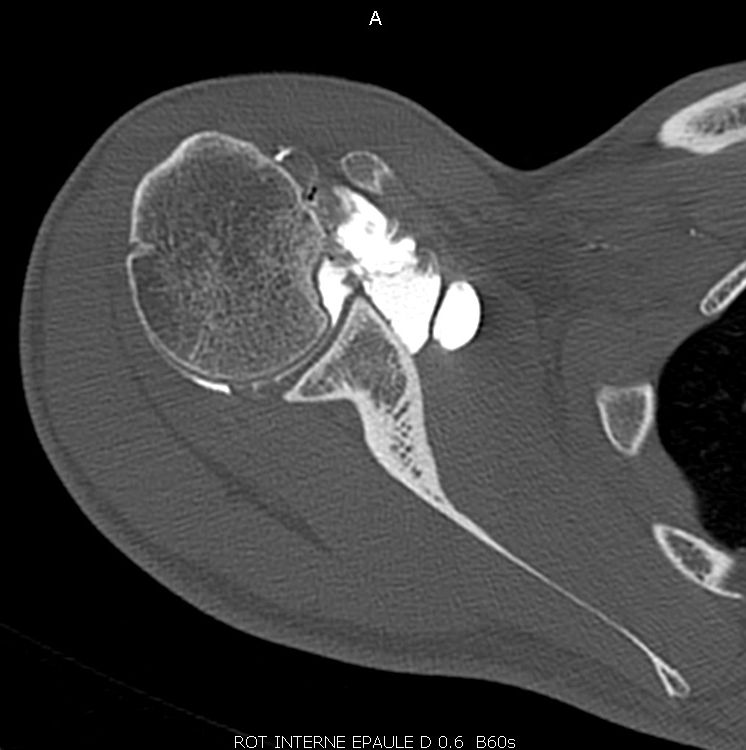 A CT scan is the best way to both analyse bone lesions and search for glenoid hypoplasia, dysplasia or retroversion as predisposing factors (Fig 1). Posterior labral damage on contrast-enhanced images may also indicate a labral fissure (Fig. 2). However, any such capsulolabral detachment is only pathological if located at the inferior, subequatorial portion of the bone.