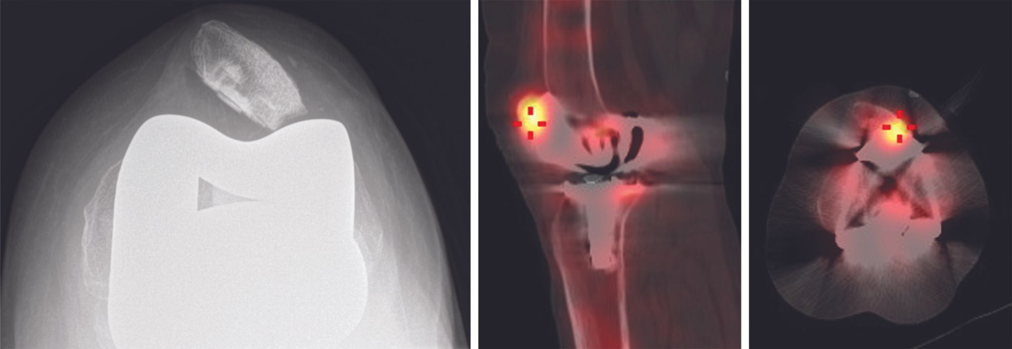 Finally, bone scintigraphy can identify patellofemoral impingement between the lateral patellar facet and femoral component, as a result of tilting. Currently our standard practice is to perform a combined CT and bone scan, such as SPECT-CT or a Tomoscan (multislice nuclear scintigraphy plus scan).