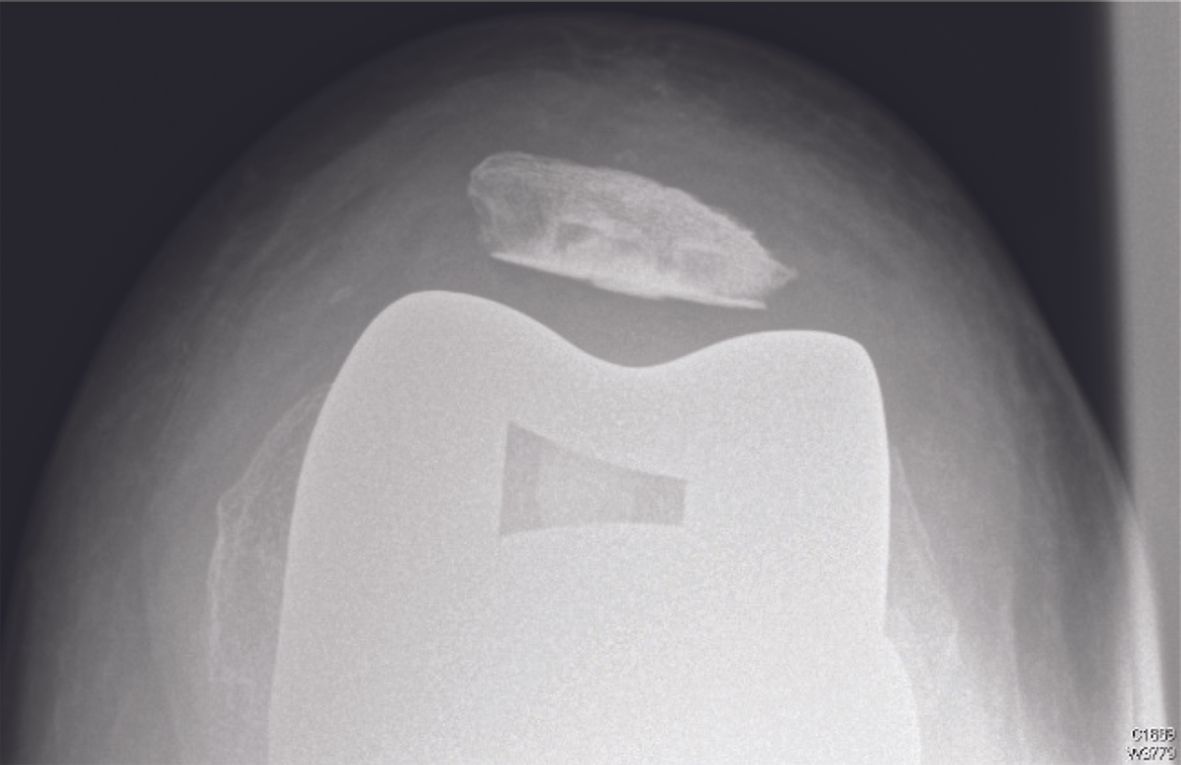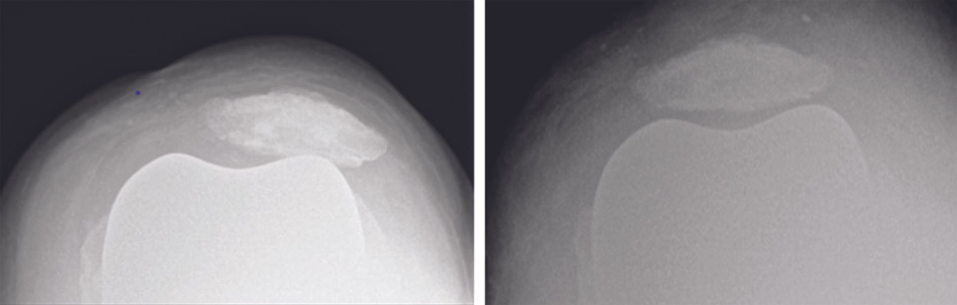 These clinical signs will help guide the subsequent radiology examination, which should begin with plain images (AP, lateral and axial view of the patella flexed at 45°). The diagnosis is positive when the patella is partially or totally dislocated. The differential diagnosis includes patellar loosening, patellar fracture, and extensor apparatus disruption.