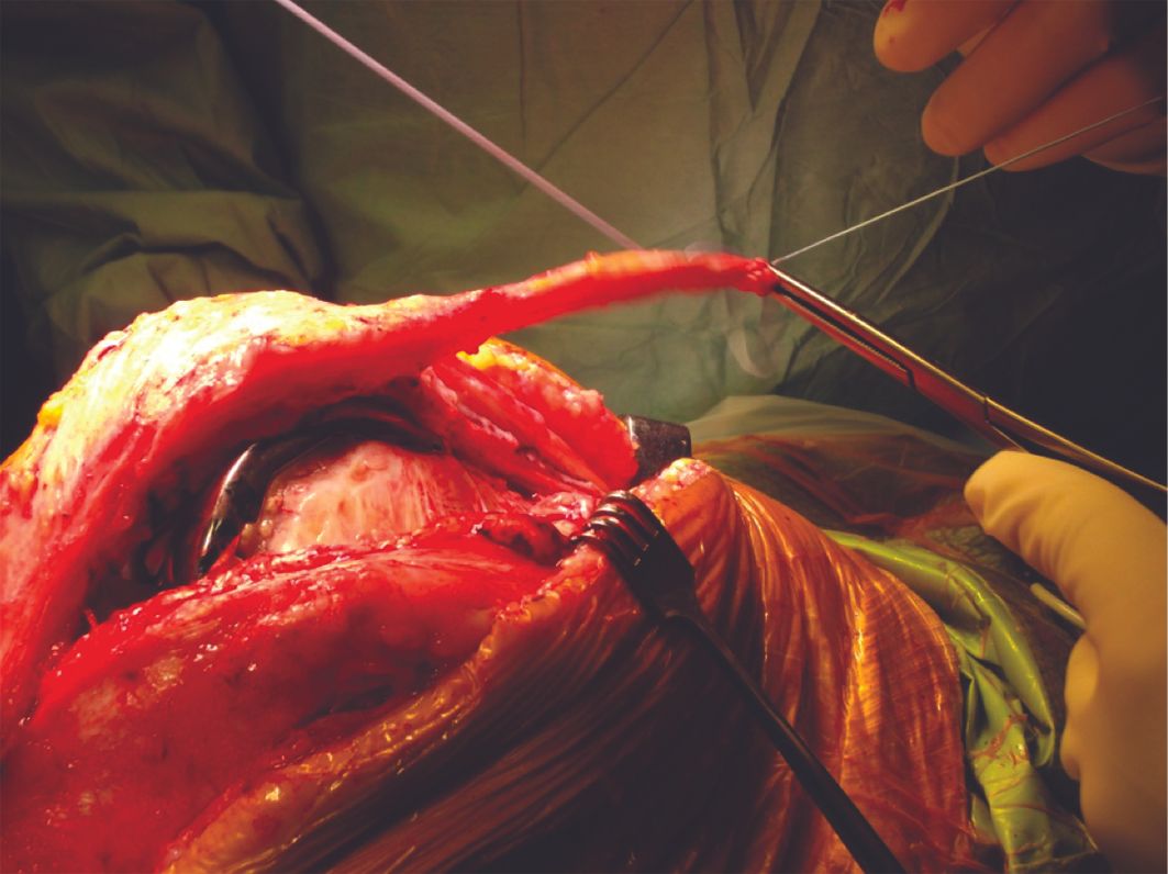 We use a strip that is 1cm wide, 10cm long and 5mm thick, harvested from the mid third of the quadriceps tendon, taking care to preserve continuity. The distal end is left pedunculated to the patella. The free end of the graft is then prepared with a suture, 25mm along.