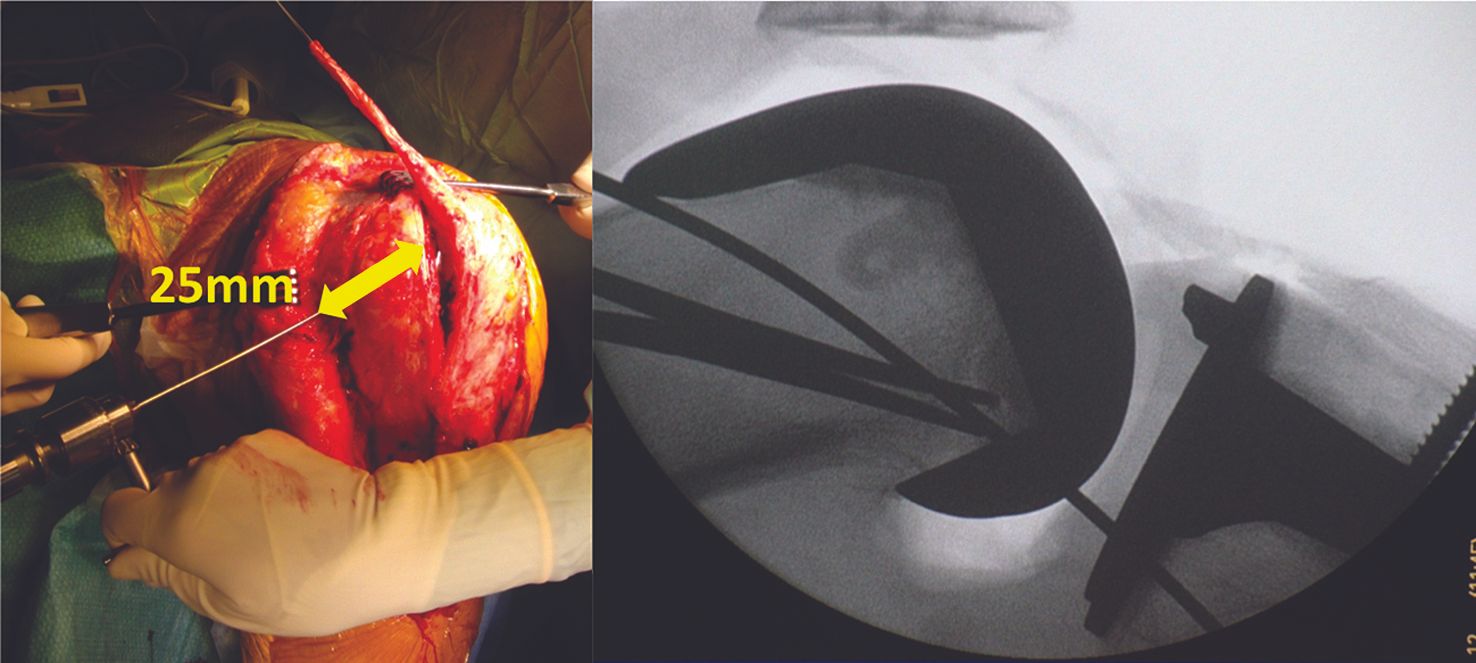 Femoral fixation is achieved in exactly the same way as for a MPFL on a native knee: a blind tunnel is made at the isometric point [20] above the adductor magnus tubercle, either using the same approach or by making a counter incision a few millimetres opposite.