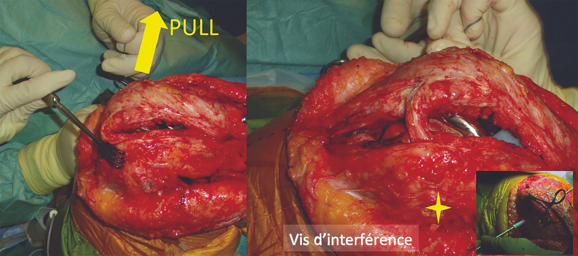 The graft is passed outside the capsule. Finally, graft tension is adjusted at 30° of flexion. The patella must be centred and mobile, but not to the point of allowing dislocation. Make sure the patella is not too tight medially. Lateral movement of 7–9mm is recommended. The graft is then fixed with a resorbable interference screw.