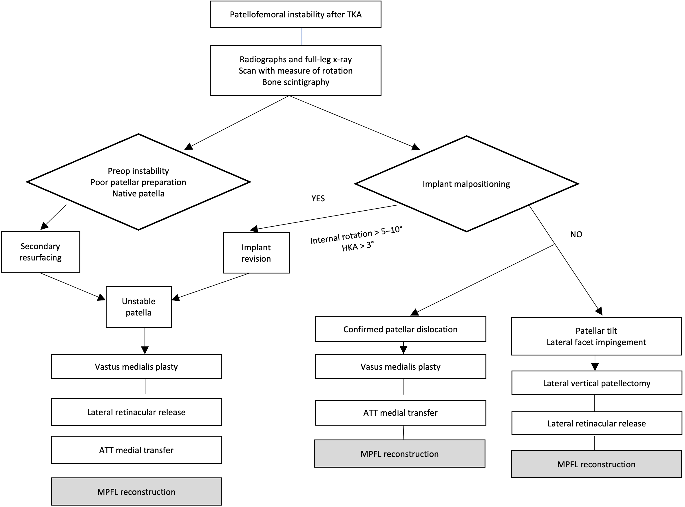 The treatment options available for correctly aligned implants without malrotation or persistent intraoperative instability encompass several techniques, which can be used alone or combined with the aim of restoring correct patellofemoral alignment: