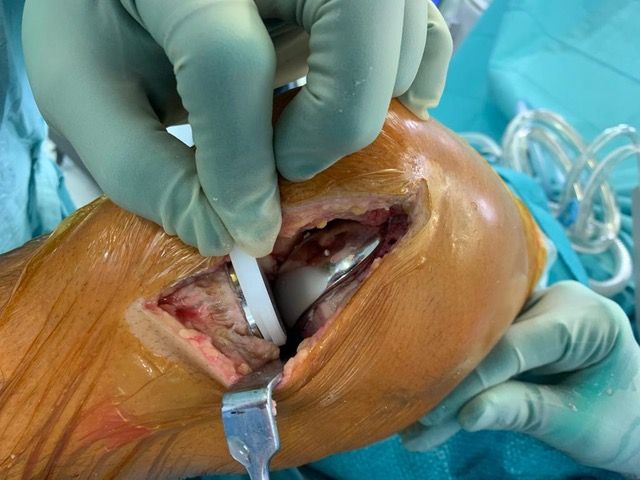 One stage procedure is possible when causative bacterium is known and it is characterized by an accurate synovectomy removal of all infected tissues and UKA components. The synovectomy of the post capsule is the critical part, which can be reached only after the bone cuts are done. With one stage exchange it is strongly recommended to remove all drapes and instruments after debridment and explantation and to set up a new set of sterile drapes and equipment before carrying on performing the re-implantation, as if two operations were going to be made. Finally, in most of the cases a primary TKA with a course of intravenous antibiotics can be implanted. A revision knee system with stems and augmentations should be available in the theatre in case of severe bone loss.
