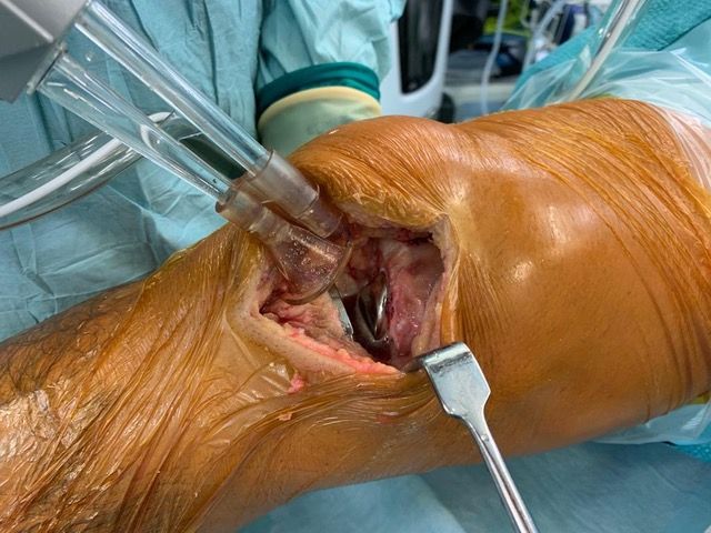 DAIR procedure has evolved through a number of stages, but now is accepted as an open procedure with removal of the synovium that is accessible around the implant, removal of and discarding of the polyethylene tibial insert and copious jet or power lavage with at least 4 litres of saline. (Fig 1).