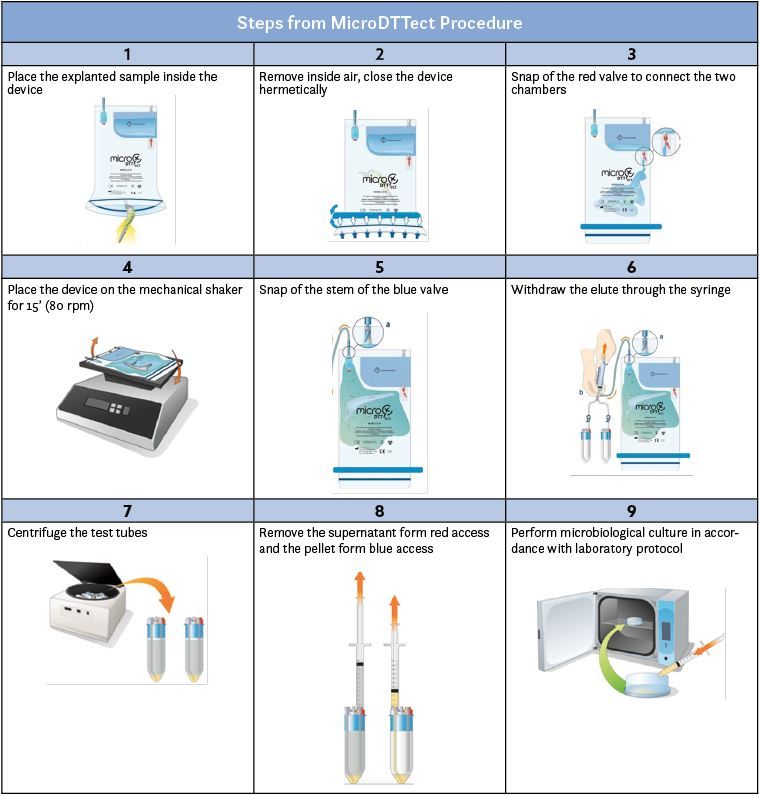 A completely closed circuit from the surgical field to the microbiological lab have been recently developed, which prevents sample contamination, thus increasing the specificity. MicroDTTect (Figure 1, kindly provided by NovaHealth srl, Italy) represents indeed the first and the only patented system for sample microbiological collection, transport and processing, that combines the increased sensitivity of the DTT with a completely closed system.