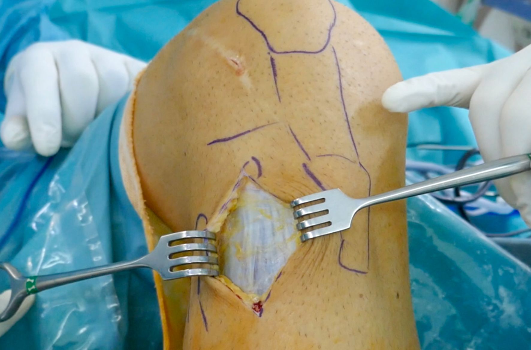 In order to go proximal to the TT, the patellar tendon must be identified and even a 5mm detachment of the most proximal fibers can be perform with a #15 blade to obtain more room for the osteotomy procedure. A lateral retinaculum release is usually performed to protect the tendon and to prevent excessive increment of the lateral patellofemoral forces with the derotation.