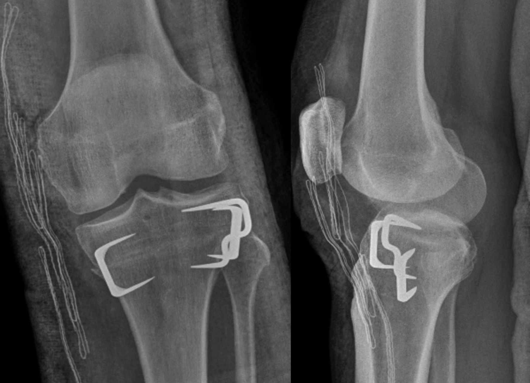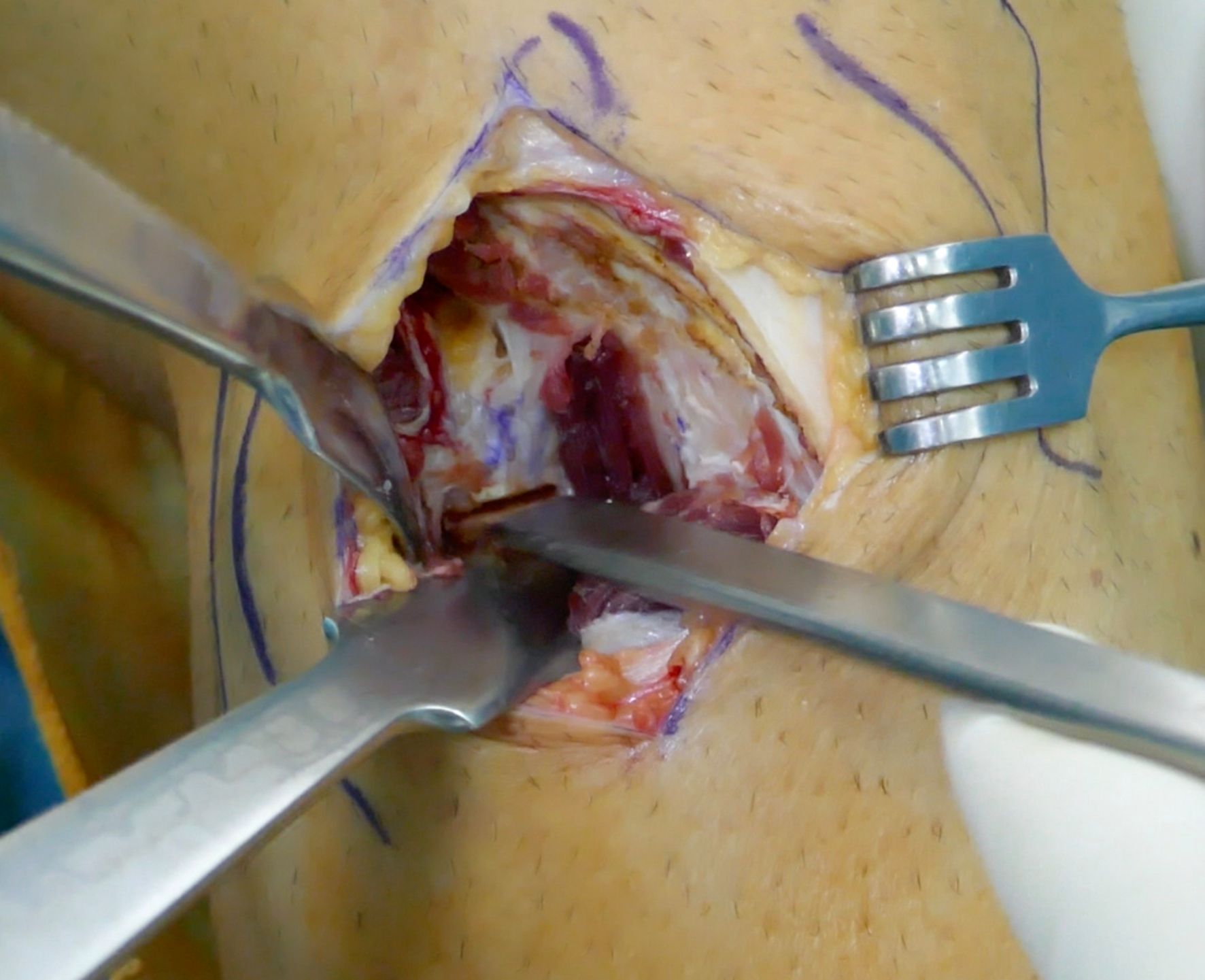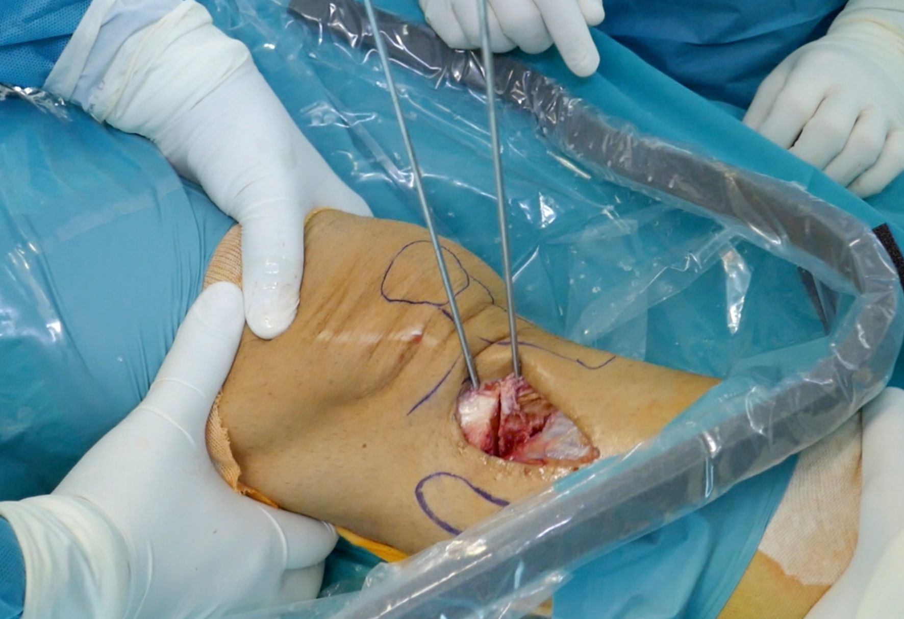 In isolated supratuberositary osteotomies, lateral compression staples are usually enough for a correct fixation. It reduces the operating time and maintains the correction of the torsion quickly when obtained, while also being less irritating for soft tissues than a plate. The use of two staples is recommended. The first staple is inserted from lateral to medial (Figure 13), and the second staple can be inserted in the same manner or, if possible, from anterior to posterior, perpendicular to the other to prevent loss of rotation (Figure 14). In some cases of medial opening after fixation, a further staple can be added on the medial side with a small incision (Figure 15). However, this is not advised as the medial staples can be highly irritating.