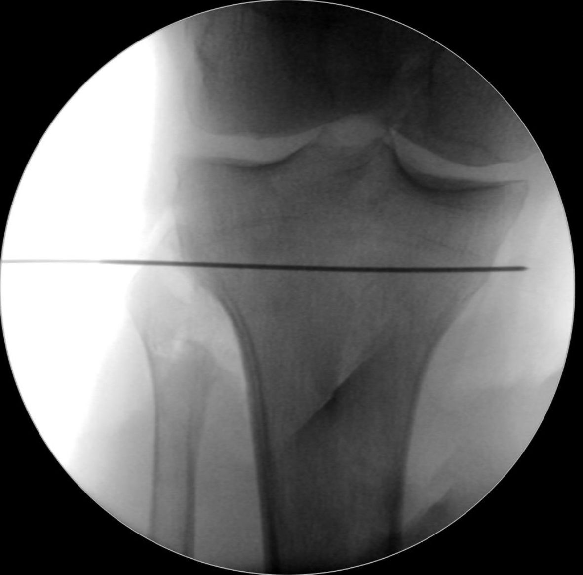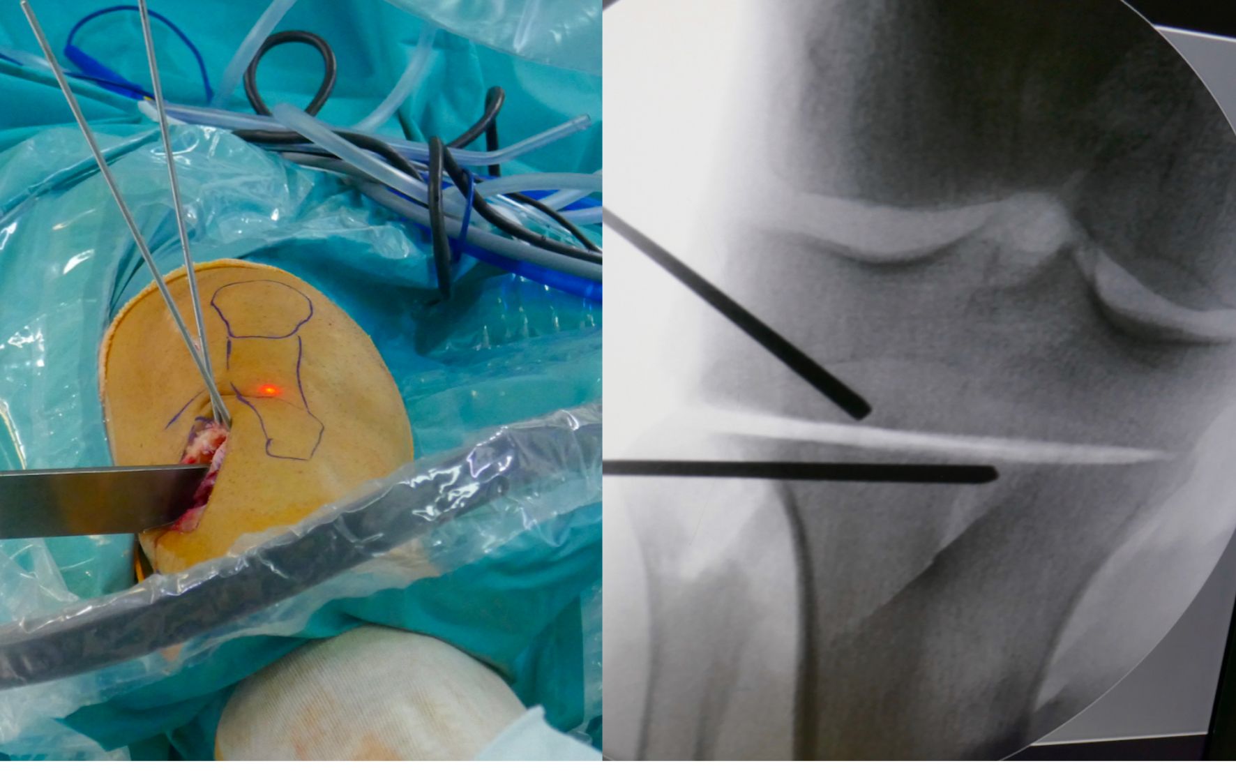 At this point, the level of the torsional osteotomy is defined by a k-wire (2 mm). The osteotomy needs to be exactly parallel to the joint line in the coronal and sagittal planes to avoid a second deformity in the frontal plane by an oblique osteotomy (Figure 6). To achieve a better control over the sagittal plane, it is recommended to position 2 k-wires in the first cases parallel to the tibial slope. However, in experienced hands this is not always necessary.