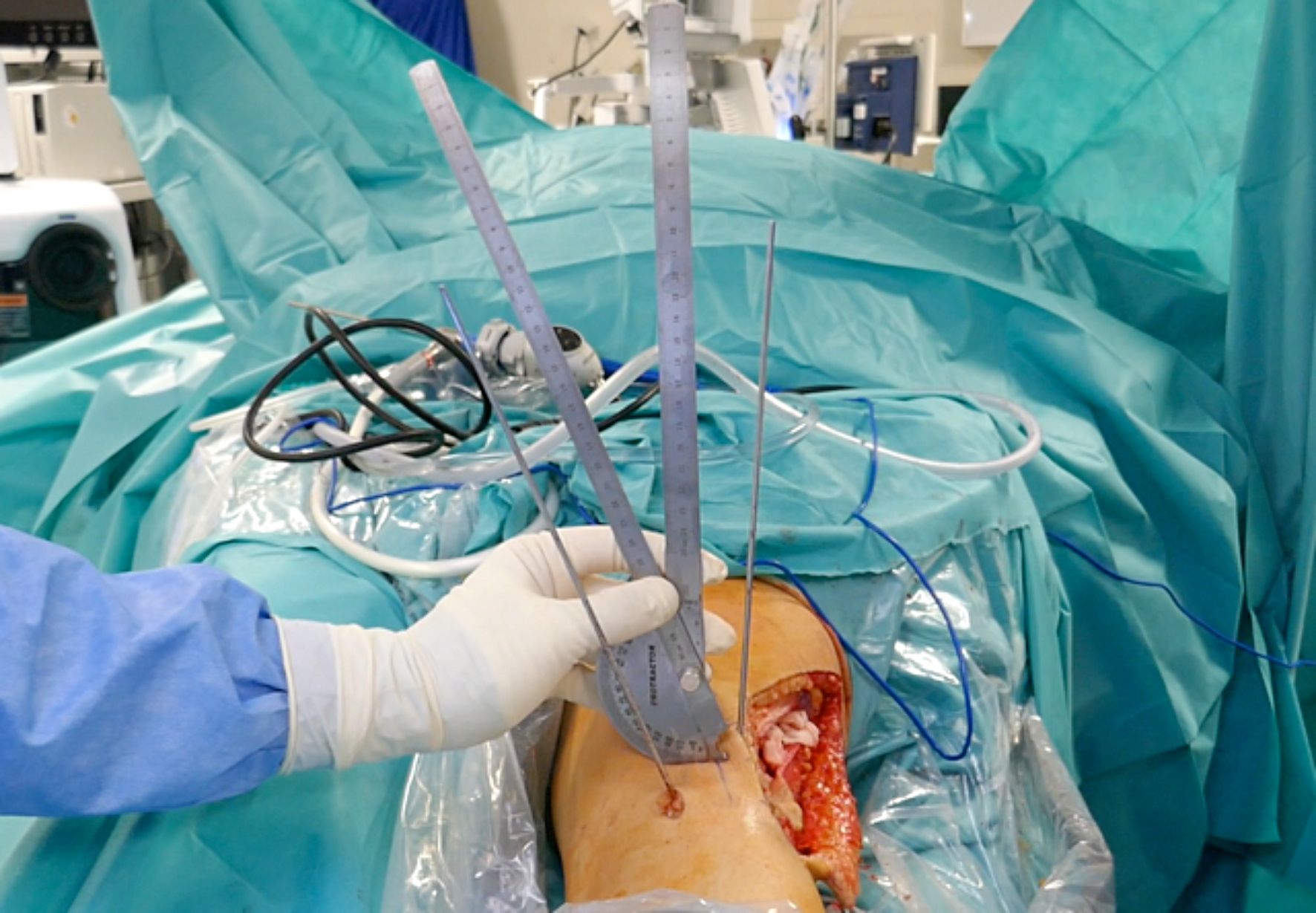 The critical step of the surgery is to correctly measure the amount of correction to avoid under or over-correction. This can be achieved with a sterile angle gauge or goniometer as shown (Figure 8). If a goniometer is not available, you can predict the amount of correction on an axial view of the CT scan at the level of the osteotomy, measuring the millimeters between the angle of correction at the cortex of the tibia. Recently, patient specific instrumentation (PSI) has also been developed for more accuracy of the correction as planned in a prior CT scan.[10]