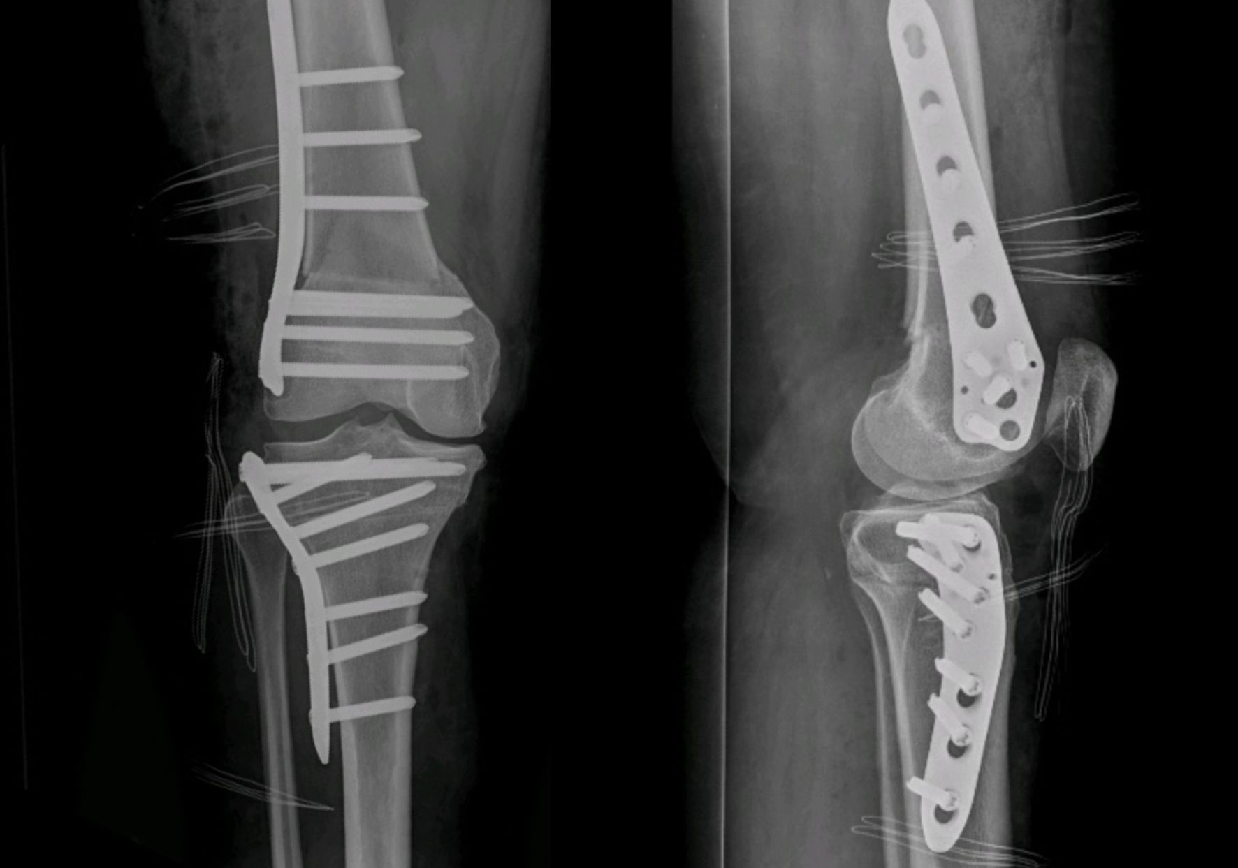 Once the derotation is achieved, the tibia must be fixed in the new position. This can be done with specifically designed plates and screws, or with staples. This decision will be left to surgeon's preference. Plating has the advantage of more theoretical stability. However, its drawbacks include losing some degree of correction while plating (longer time screwing), longer procedure time, need of hardware removal, longer incision, and a higher cost. It is likely more suitable for tridimensional osteotomies (correction of valgus and torsion) where a more rigid fixation is required (Figure 12).