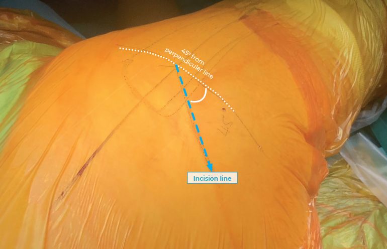 The initial incision is directed 45 degrees posteriorly and upwards from the incision's starting point at the greater trochanter's posterosuperior corner (Figure 2). The STAR approach goes parallel to the muscle fibers of the gluteus maximus muscle. It is also in line with the skin's Langerhans lines, which presumably leads to better healing without excessive scarring.