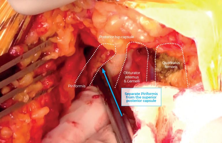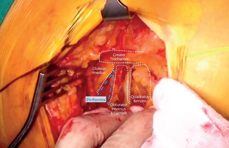 The STAR approach is a muscle-sparing technique preserving the tensor fasciae latae, PF, obturator externus, quadratus femoris, the glutei muscles, and particularly the femoral insertion of the GMed and GMin. It is easier to identify and protect the PF tendon through the STAR approach. The tendon is separated from the conjoined insertion (Gemelli and obturator internus) below and adjacent to the piriformis fossa and is lifted along with the GMed and GMin away from the surgical field.