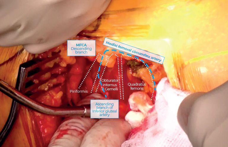 Meticulous hemostasis is performed at this stage at the femoral insertion of SER. The primary vascular supply of the area comes from the medial circumflex femoral artery (MCFA) ascending along the inferior border of the obturator externus, crosses the middle of the quadratus femoris anteriorly, and then turns almost 90 degrees parallel to the posterior femoral neck leaving at the turning point a short trochanteric branch [3]. It then passes anteriorly to the SER's insertion and then crosses the interval between the PF and the upper border of the superior gemelli. It then anastomoses with a vertical branch of the inferior gluteal artery that descends over the PF, the latter branch usually acting as an indicator of the PF [3] (Figure 4).