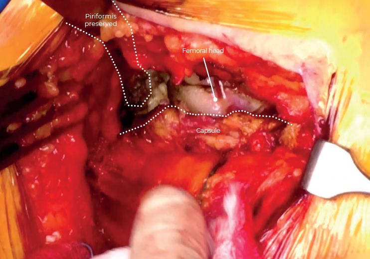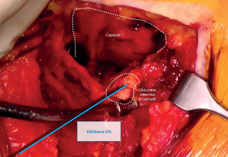 The hip is then flexed and internally rotated to fully expose OI and gemelli tendons that are tenotomised close to their femoral insertion. These tendons are stripped off the posterior capsule, tagged with an Ethibond suture, and retracted posteriorly to keep the sciatic nerve safe (Figure 6).
