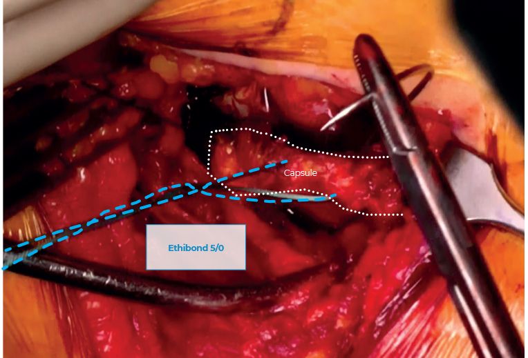 Obturator externus and quadratus femoris remain intact. The capsule is then exposed and incised from distally starting at the lower border of the posterior neck, parallel to the intertrochanteric line and up towards the PF fossa. It then crosses vertically down to the posterior acetabular rim in line with the PF's inferior border, protected by a slim retractor (Figure 7). The capsular flap that is formed is tagged with a running Ethibond suture and pulled back(Figure 8).