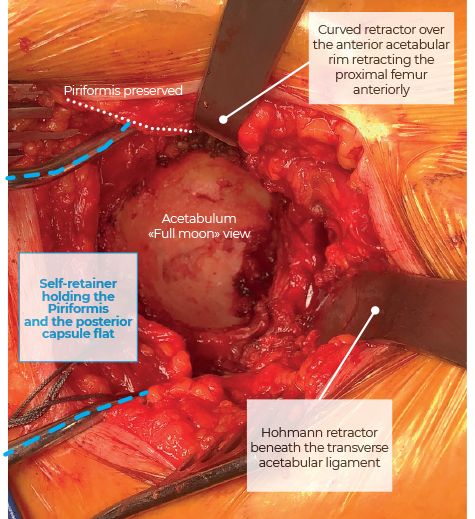 The hip is then flexed and internally rotated; the hip is dislocated, and the femoral head is removed. The leg remains in adduction and internal rotation to give the surgeon access to the anterior neck osteophytes and anterior capsule. A curved retractor is placed over the anterior acetabular rim to retract the proximal femur anteriorly while the leg is flat on the table (Figure 9). The surgeon is then free to remove the anterior labrum and, if necessary, to pie crust the rectus femoris' reflected head. Access to the acetabulum is facilitated with a Hohmann retractor positioned beneath the transverse acetabular ligament (Figure 9). A small self-retainer is placed superoposteriorly to hold the PF above and the posterior capsular flap away during reaming (Figure 9). We used straight reamers and other instruments for cup preparation and implantation.