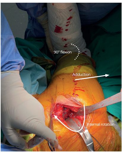 During femoral preparation, the hip is placed in flexion, adduction, and internal rotation. The assisting surgeon holds the knee flexion of 90° with the tibia vertical, exerting longitudinal force to the leg to adequately expose the femur (Figure 10).