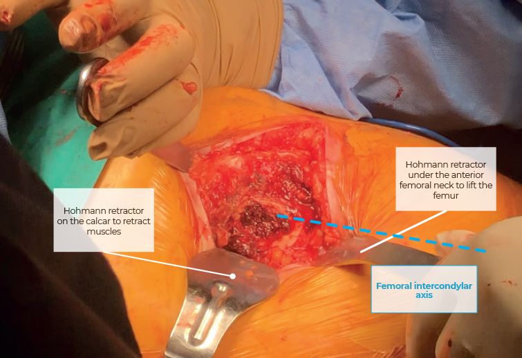 Two blunt Hohmann retractors are needed at this step; the first curved Hohmann is positioned under the anterior femoral neck to lift the femur and the second on the calcar to retract muscles away. This way, anteversion of the femoral neck and ante-torsion of the proximal femur can be readily appreciated as the distal femoral intercondylar axis can be directly visualized, especially to the vertical proximal tibia that is held straight up (Figure 11).