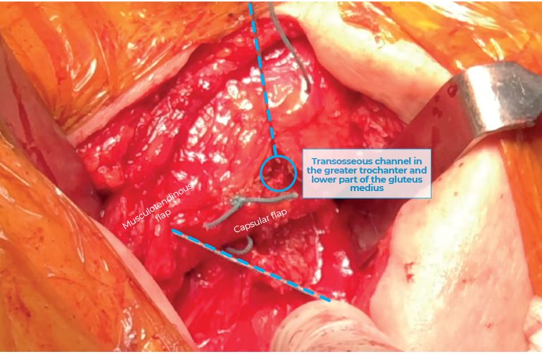 Once the definite components are implanted, the tendinous-capsular flap is repaired. The capsular flap is repositioned first, followed by the musculotendinous flap. Reposition is mediated with tagging sutures passing through a transosseous channel made in the greater trochanter and lower part of Gmed (Figure 12). The other layers are closed with running absorbable suture. No deep drain is used.