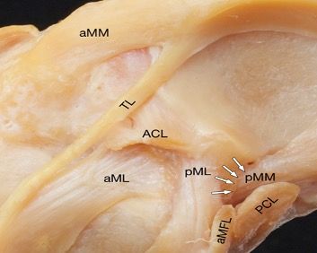 In this rotatory instability, there are varying extra-articular lesions of the anterolateral structures and posteromedial capsular plane. Lesion assessment of the medial plane must include both the meniscotendinous complex of the semimembranosus and the medial meniscotibial ramp. The semimembranosus is likely to be involved in the physio-pathogenesis of a medial meniscal ramp injury because of its anatomical relationship with the posterior segment of the medial meniscus and the meniscotibial ligament (33). Thus, according to Hughston, the reflex contraction of the semimembranosus during trauma from excessive anterior tibial subluxation secondary to ACL rupture stresses the posteromedial capsule while the meniscus is trapped between the femur and tibia, leading to tears in the meniscocapsular and/or meniscotibial ligaments (34). These lesions correlate with a high-grade pivot shift so it is important to look for and include them in surgical planning to restore the rotational kinematics of the knee (32).