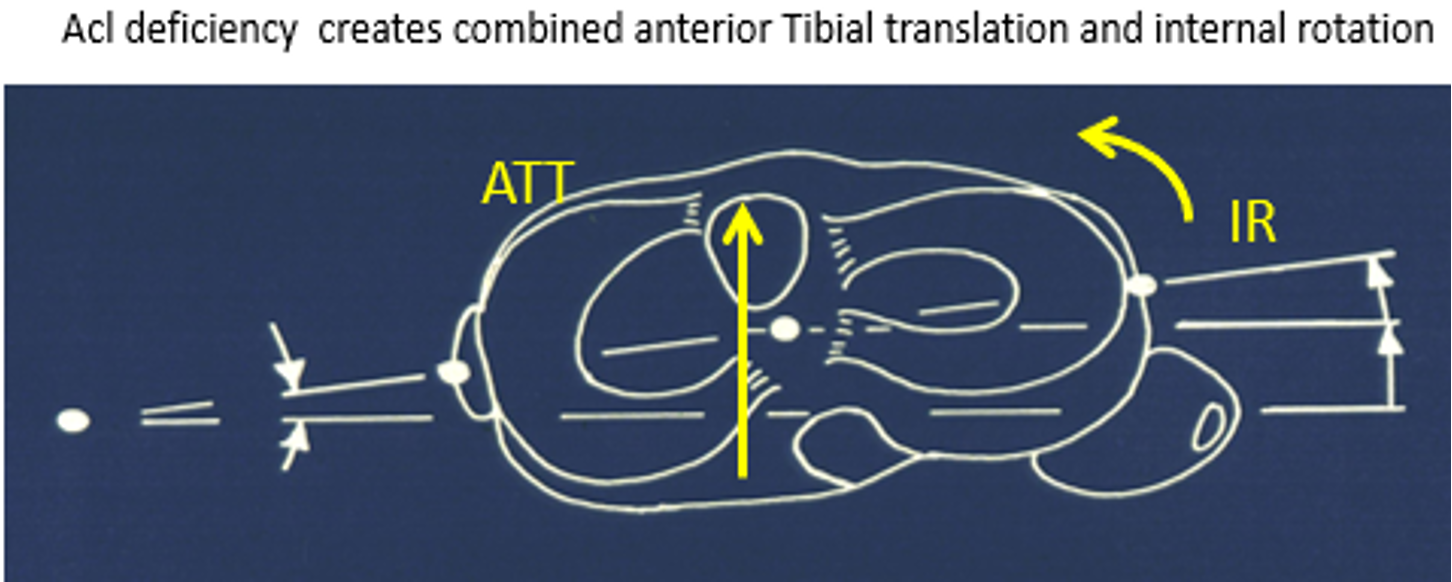 ACL rupture is responsible for rotational instability with a recoil of both condyles (lateral condyle >medial condyle) and posterior subluxation of the lateral condyle. Tibial internal rotation is reduced by approximately 13 ± 8 degrees during the pivot shift manoeuvre with a posterior translation of the tibia by approximately 12 ± 8mm (20).