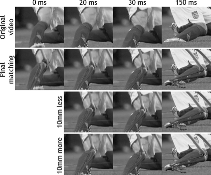 These images allowed a 3D analysis of the movement. At the time of the ACL rupture, the knee was flexed between 26–35°, after which the flexion angle continued to increase. The knee had an estimated valgus motion of 21° and the internal rotation was 21°. Anterior tibial translation ranged from 9–22 mm before returning to a reduced position (Figure 4).