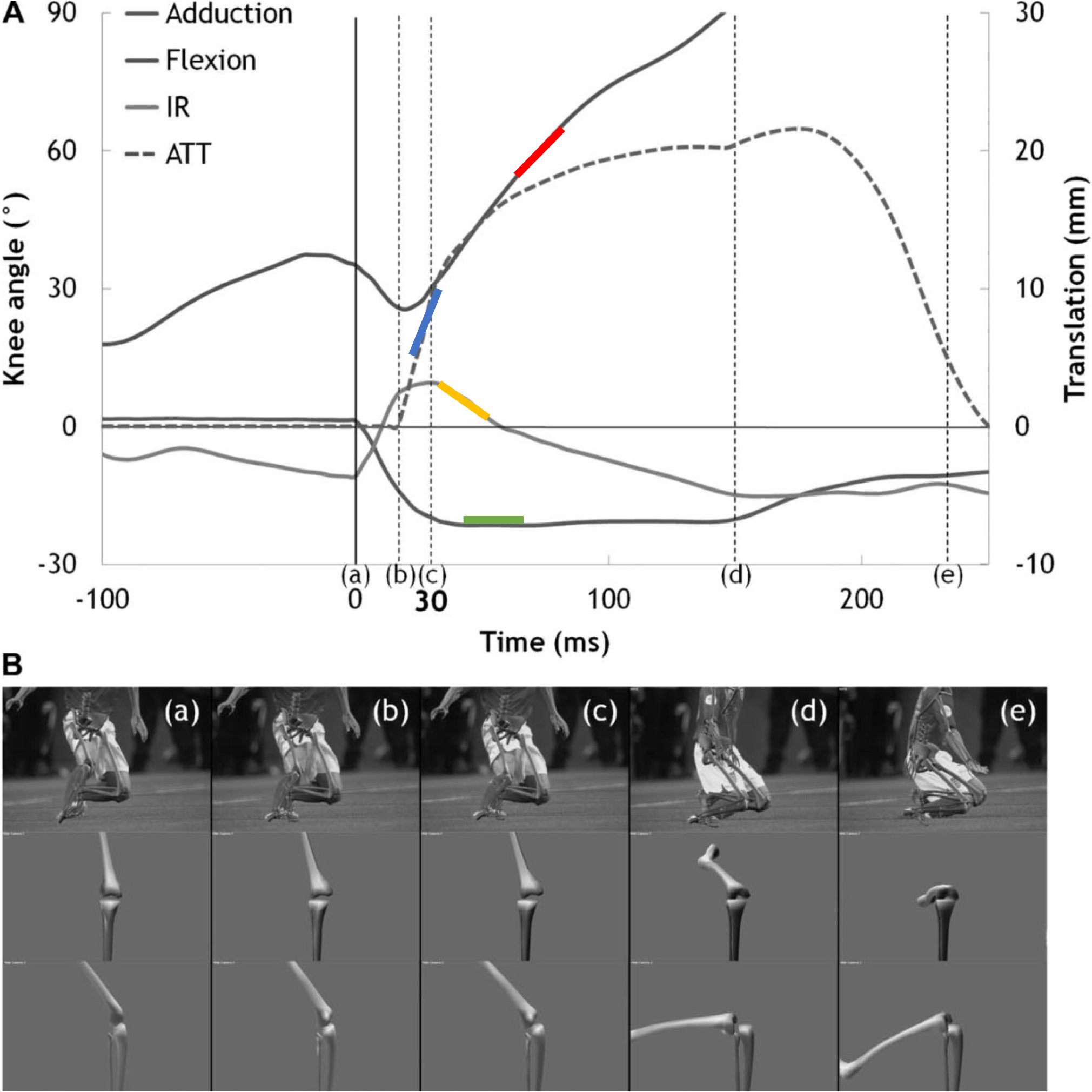 Numerical modeling has provided new options to address knee trauma. Koga et al. analysed the kinematics of an ACL rupture from images of a non-contact injury of the anterior cruciate ligament of a professional athlete during a football match (Figure 3) (21).