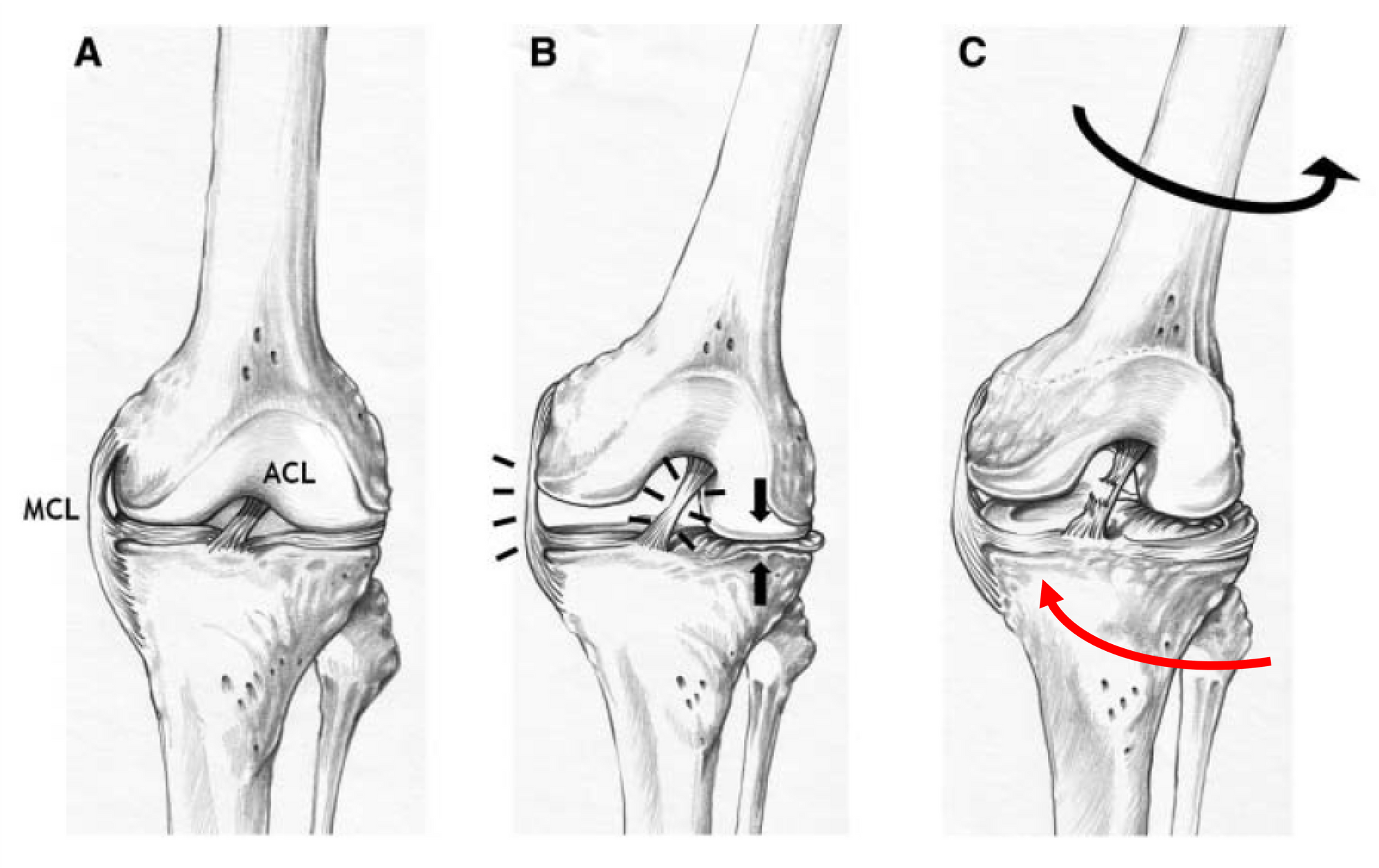 In the initial phase, a valgus stress is applied, causing tension in the medial collateral ligament (MCL) and compression in the lateral compartment. This compressive load, together with the anterior force vector caused by the quadriceps contraction, causes a displacement of the femur relative to the tibia. While the lateral femoral condyle moves backward, the tibia moves forward and internally rotates, resulting in a rupture of the ACL. Once this occurs, the main restriction to the anterior translation of the tibia disappears. The lateral femoral condyle is also displaced posteriorly, causing the medial condyle to move posteriorly and resulting in external rotation of the tibia.