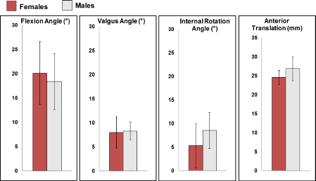 Owusu-Akyaw et al. extrapolated the position of the knee at the time of ACL rupture from reconstructed MRI images and observed bone swellings (23). No significant differences were found by gender (Figure 6). At the time of rupture, the knee was in flexion at 18.4°–20.2°, the valgus was estimated at 8°–8.3°, the internal rotation was estimated at 5.3°–8.6°, and the anterior tibial translation was estimated to be 24.6 mm–26.9 mm.