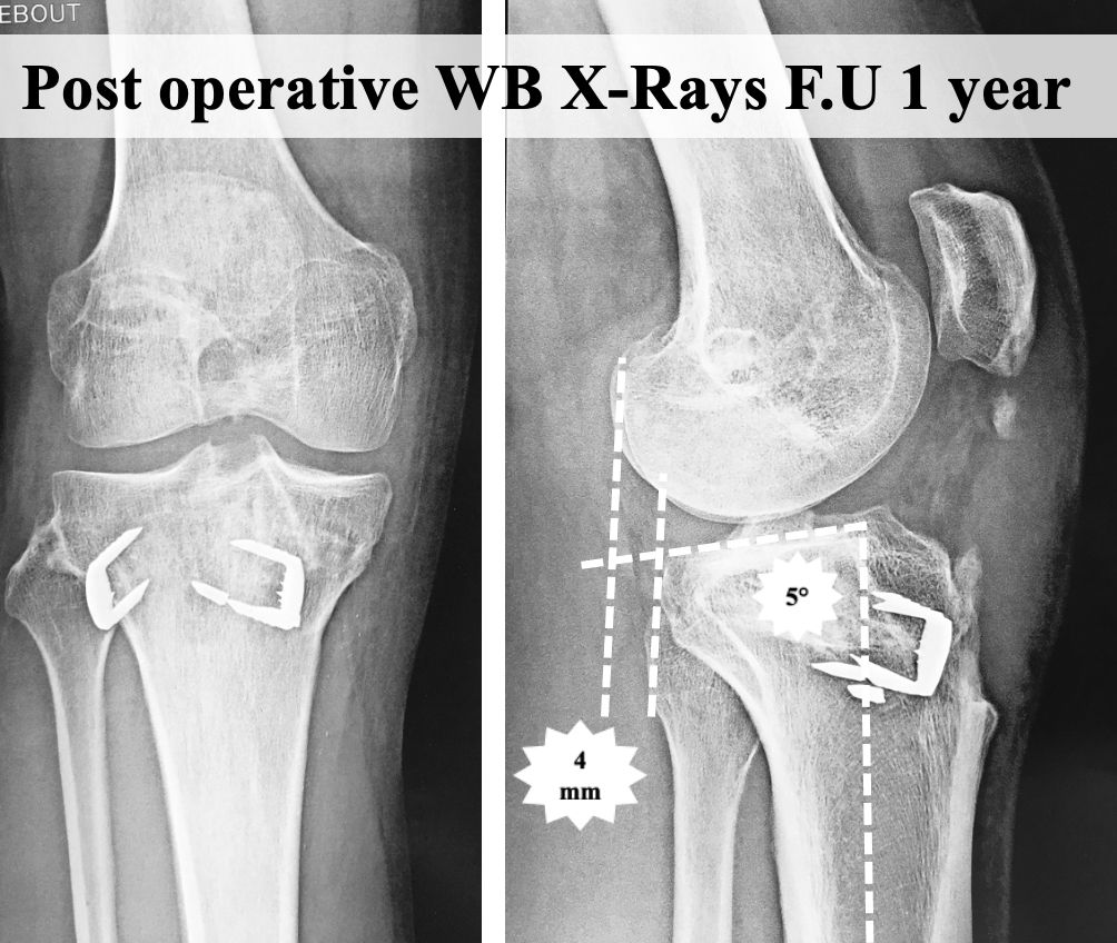Even if the surgical technique has been known for a long time, it is still not used worldwide. Several papers pointed out the association between high posterior tibial slope and ACLR failure [11,16]. Also, the retear rate reported for revision ACLR without tibial deflexion osteotomy is significant, ranging between 13 and 42% in the literature [17–19]. Yet there are still few literature papers available on tibial deflexion osteotomy associated with ACLR. Correction of high posterior tibial slope cannot be overlooked, mainly for patient with repeated ACL tears. Since 2014, results of small cohort of patient were published. The results of one stage tibial deflexion osteotomy performed revision ACLR with a minimum of 2 years follow-up were published. Two studies [14,20], including one from our surgical team, reported good functional outcome with similar IKDC subjective (71.6 and 79.1) and Lysholm scores (73.8 and 87.8) (Figure 7 A&B).