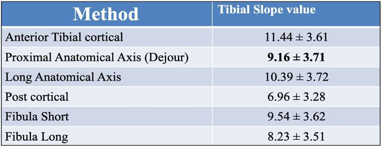 - Tibial Proximal Anatomical Axis (TPAA) : The longitudinal axis used is the line joining the center of 2 width of the proximal tibia located under the anterior tibial tuberosity and 10cm apart. Its physiological value is 9° and has a high reliability.