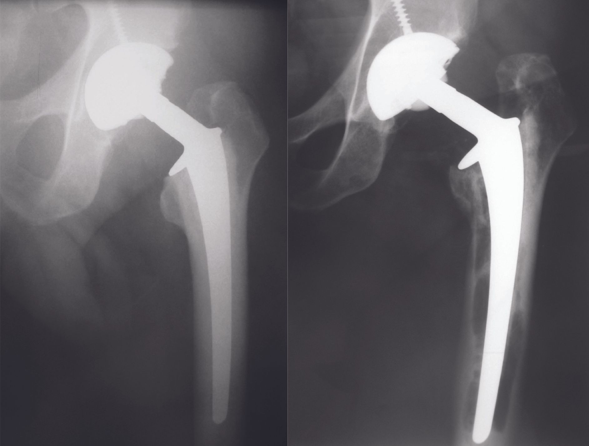 Long-neck coxa vara hips, like short-neck coxa valga hips, represent a real prosthetic challenge. Not only must the highly deformed anatomy be reproduced, but the patient must also be assured of the longevity of the femoral fixation. There are many options, of which THR seems to be the most attractive solution in a young population. THR allows correct restoration of the femoral offset, while respecting the requirements of the technique (valgus). The 9-year follow-up seems to guarantee the durability of the femoral fixation of the implants.