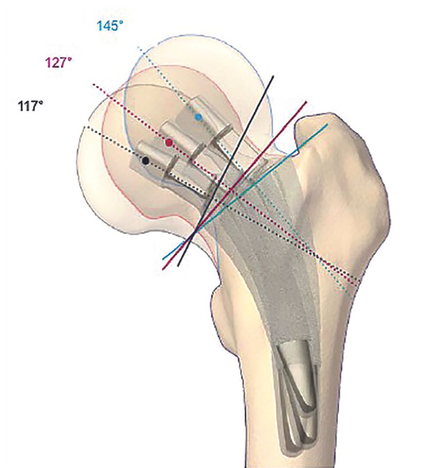 During hip arthroplasty (THR) implantation, restoration of the femoral lever arm (offset) is a crucial element in order to maintain the stability of the prosthetic joint, improve joint amplitudes and optimize the efficiency and power of the gluteal muscles [1,2]. This last point is essential, especially when the implantation is performed on a population of young subjects who wish to resume their sports activities. Indeed, adequate gluteal tension is essential for resuming activities such as running or sports with impulses on the lower limb. A value of 40 mm is commonly accepted as the upper limit of the mean femoral offset [2]. Hips with a high lever arm are very frequently accompanied by a long femoral neck and are most often found in young men and rarely in women. This is referred to as "long-neck coxa vara".
