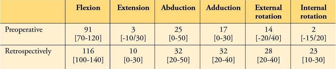 At 8 years, no patient had a limp on walking and no Trendelenburg signs were observed. Patients reported an improvement in activity level as the Devane score improved from 2.7 [1-5] to 4 [2-5] (p<0.0001). Global joint ranges improved from 150.7° [90-260] to 244° [190-300] (p<0.0001) (Table 1).