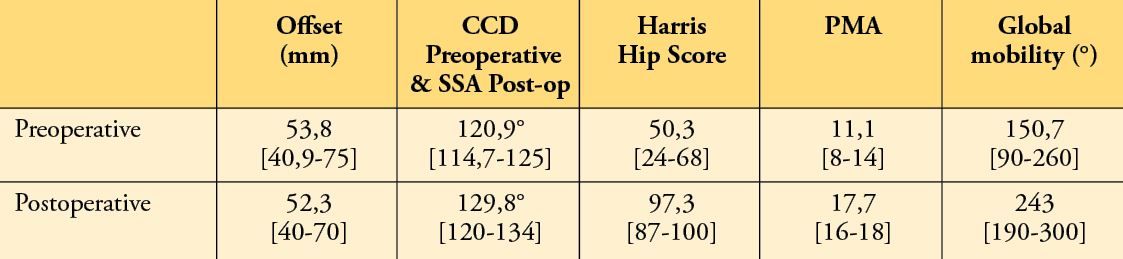 The femoral offset was thus reduced by an average of 1.6 mm (6.7/-7.8), without this reduction being significant. The SSA angle at follow-up was 131.3° [118-134]. The mean valgus gain of the femoral implant compared to the native CCD bone angle was 8.7° (-4.6/14.8) (p<0.0001). Compared to preoperative data, four patients were elongated by less than 5 mm. No dislocations or thromboembolic events were observed. No hips were revised at the longest follow-up and we did not observe any Adverse Reaction to Metal Debris complications.