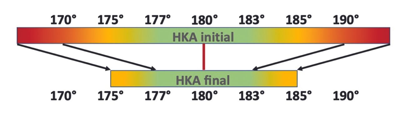 We predict that with this technique, deformities of less than 10° will be realigned at 0–3°, and those over 10° will be realigned at 0–5°. Preoperative varus should result in a postoperative HKA < 180°. Preoperative valgus should result in a postoperative HKA > 180° (Fig. 2).