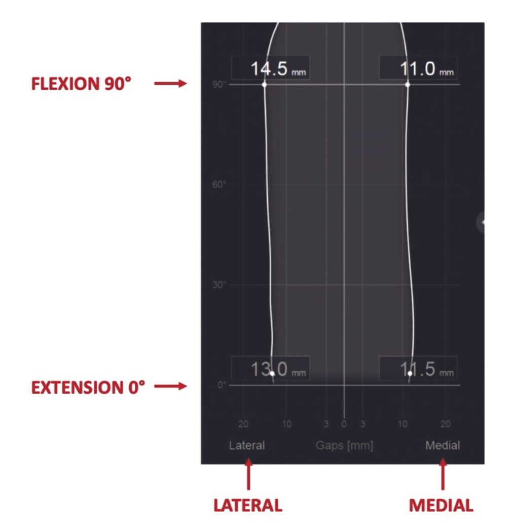 The knee is digitally modelled using standard navigation landmarks. Laxity is then measured by placing a forced valgus and varus stress on the joint, from maximum extension through to maximum flexion, as for a physical examination. The extent of the laxity is then used to determine the size of the peripheral ligament gaps between the tibial cut and the planned femoral condyles of the implant (Fig. 3).