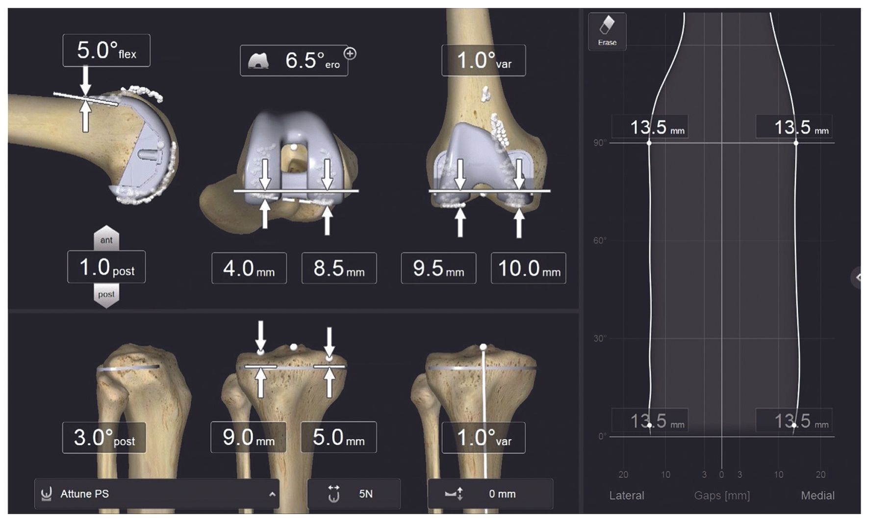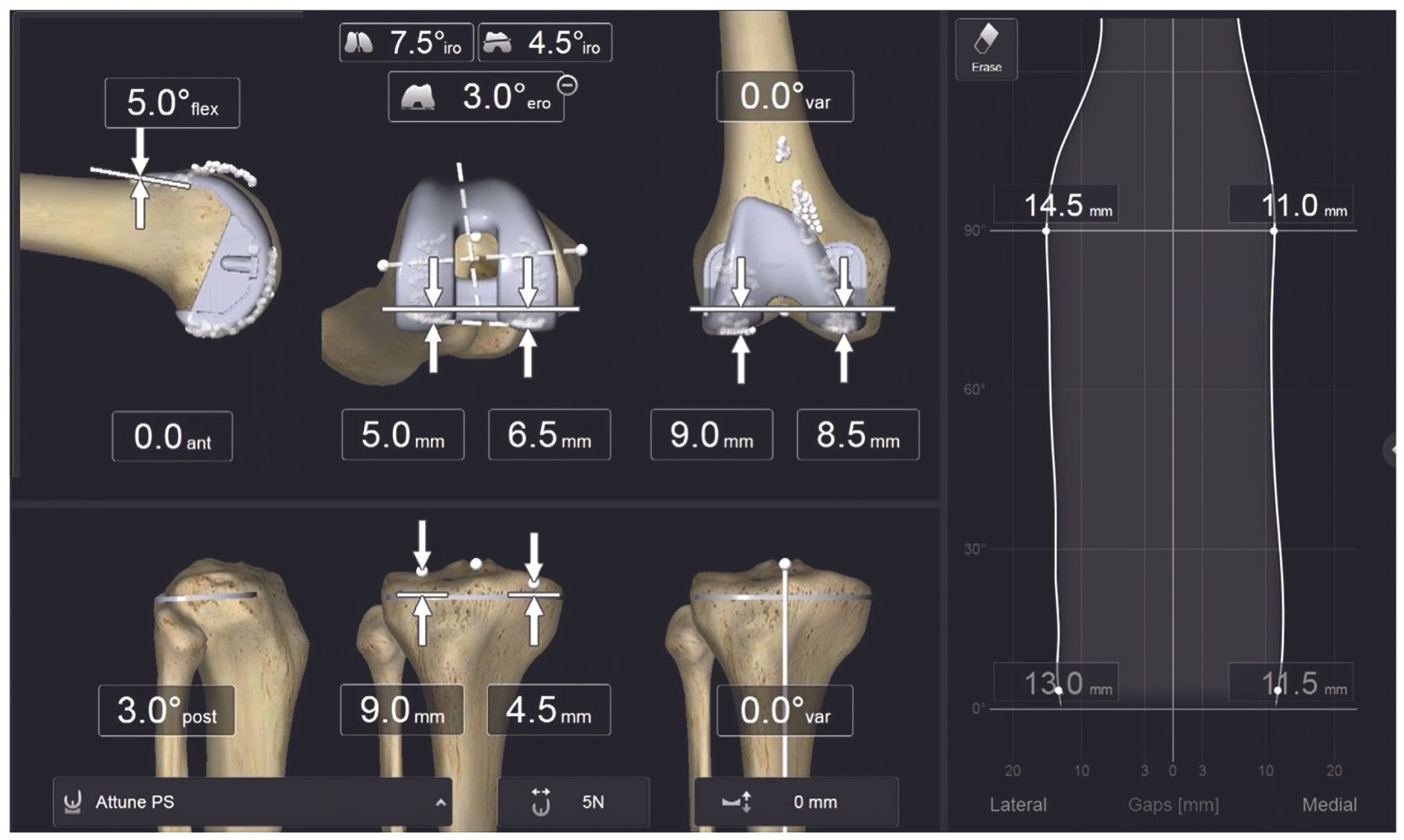 The navigation system displays the thicknesses of every bone cut. This information can be used to determine the parameters of the cuts based on the patient’s anatomy and the wear of the various compartments. Never forget that the navigation system is a tool for recording all values measured during initial data acquisition. If the navigation landmarks are not measured accurately this could skew the figures. Finally, there is no one-size-fits-all planning solution, and the parameters can be adapted to meet the goals set by the surgeon (Fig 5).