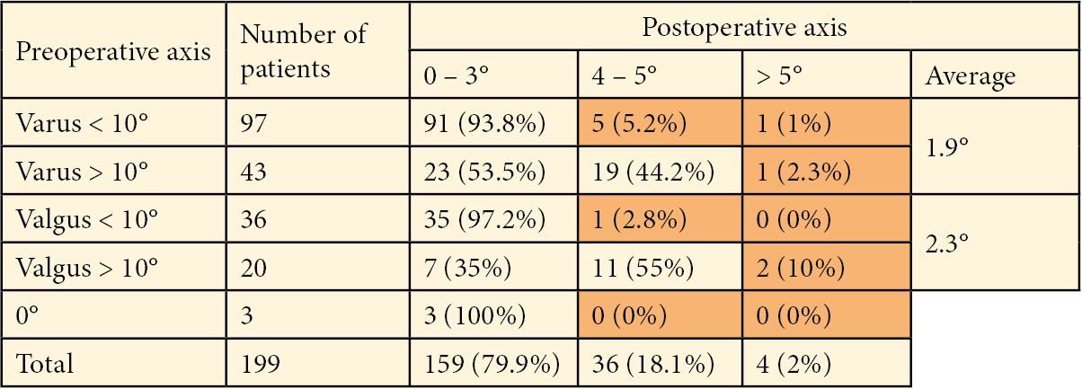 A total of 79.9% knees had a neutral postoperative axis +/- 3° by reaching the initial target. 18% of knees were borderline with residual deformity of 4-5° and only 2% of knees were outliers > 5° (highlighted in grey). There was a difference between knees without severe deformities (< 10°) compared to severe deformities (> 10°).