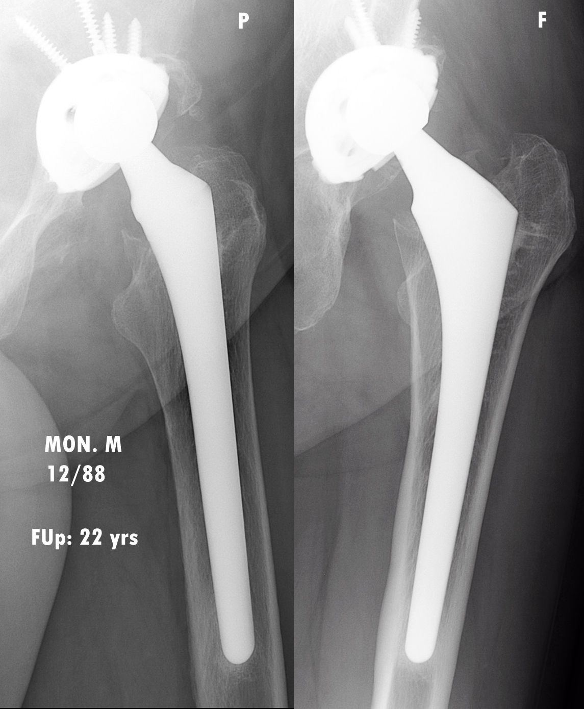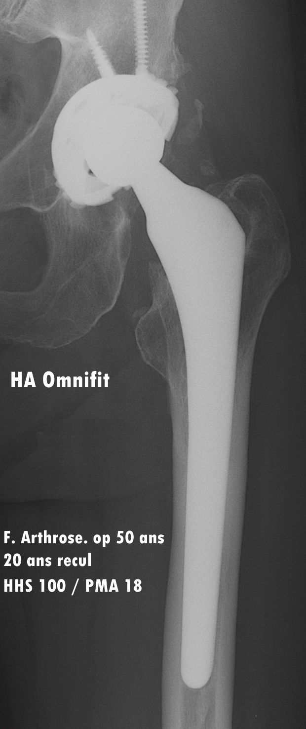 The results of this series raise two questions. First, what outcomes were achieved with the proximal HA-coating option in this population of under 50s? Second, can the clinical and radiological outcomes obtained for these young patients be considered stable in the long-term, after 20 years of clinical follow-up?